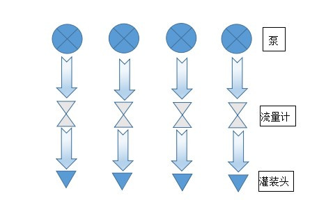 我們?cè)賮?lái)看一下這種一頭一泵的灌裝流程圖,同樣以四頭灌裝機(jī)為例: